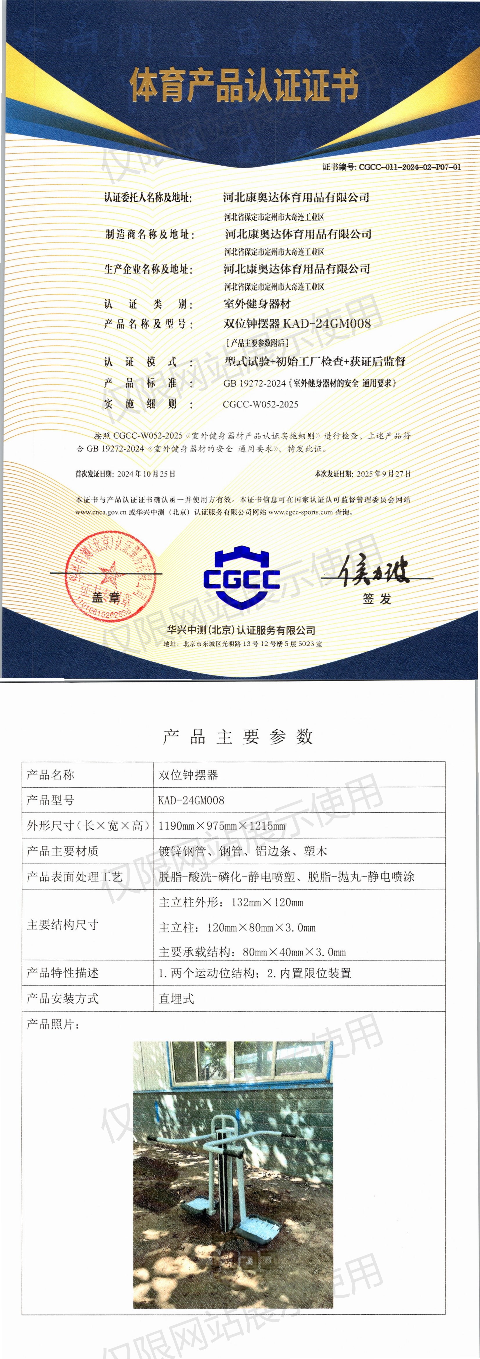 | 8 | 河北康奥达体育用品有限公司 | CGCC-011-2024-02-P07-01 | 双位钟摆器 | KAD-24GM008 | 河北省保定市定州市大奇连工业区 | GB 19272-2024 | 2024-10-25 | 有效 | 查看 |