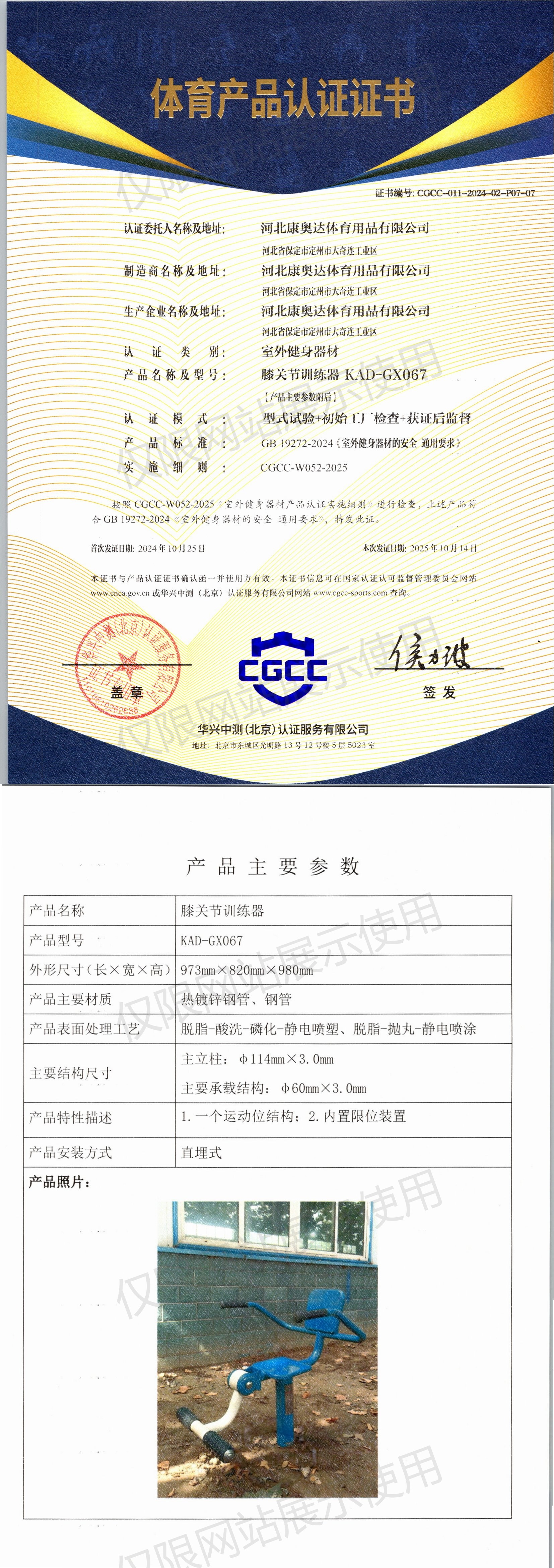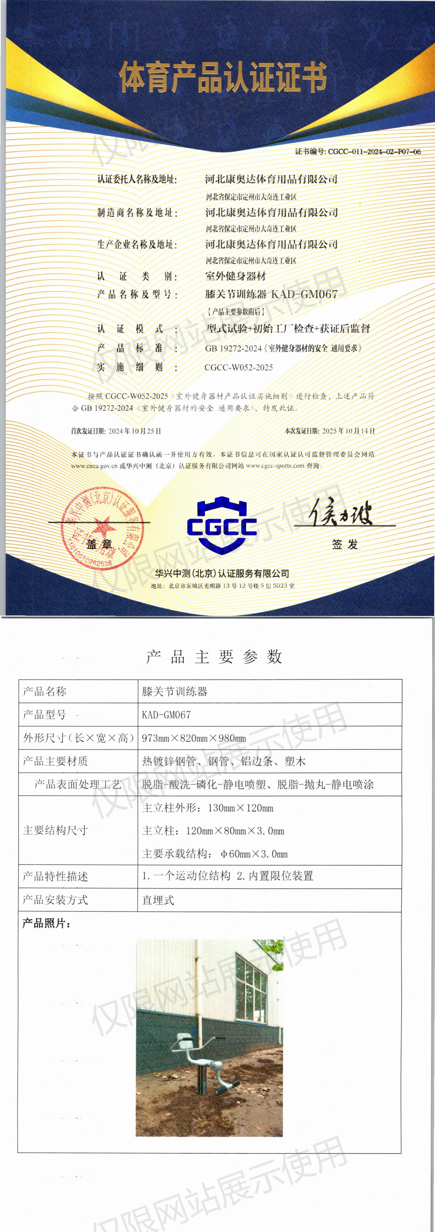 | 7 | 河北康奥达体育用品有限公司 | CGCC-011-2024-02-P07-02 | 双位漫步机 | KAD-24GM014 | 河北省保定市定州市大奇连工业区 | GB 19272-2024 | 2024-10-25 | 有效 | 查看 |