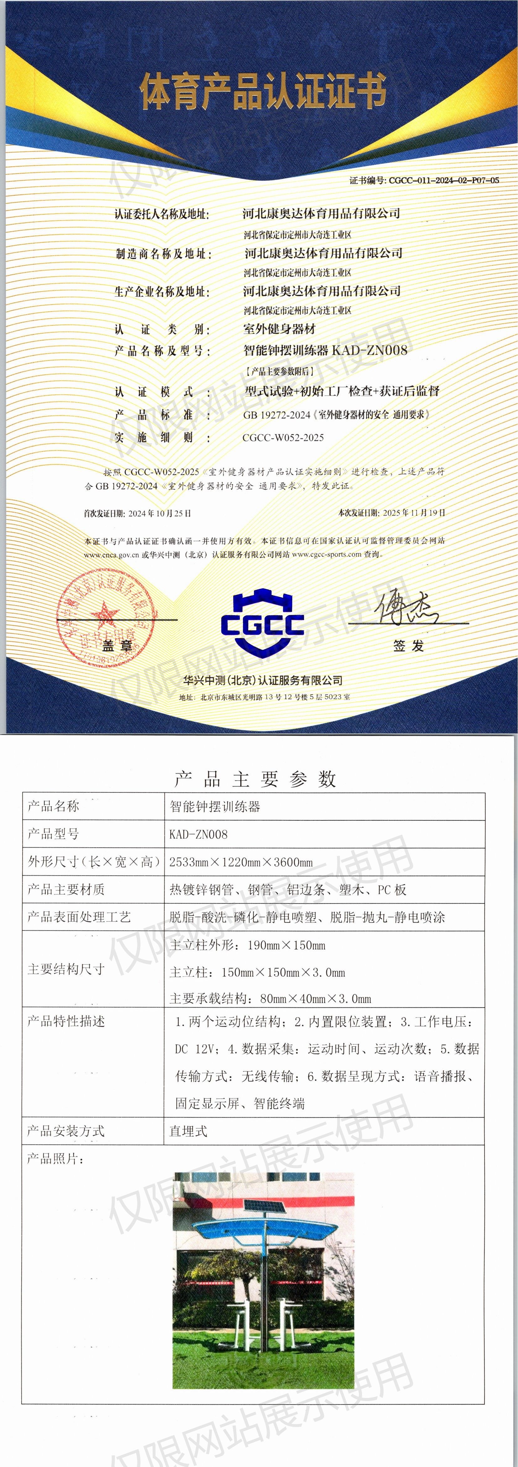 | 4 | 河北康奥达体育用品有限公司 | CGCC-011-2024-02-P07-05 | 智能钟摆训练器 | KAD-ZN008 | 河北省保定市定州市大奇连工业区 | GB 19272-2024 | 2024-10-25 | 有效 | 查看 |