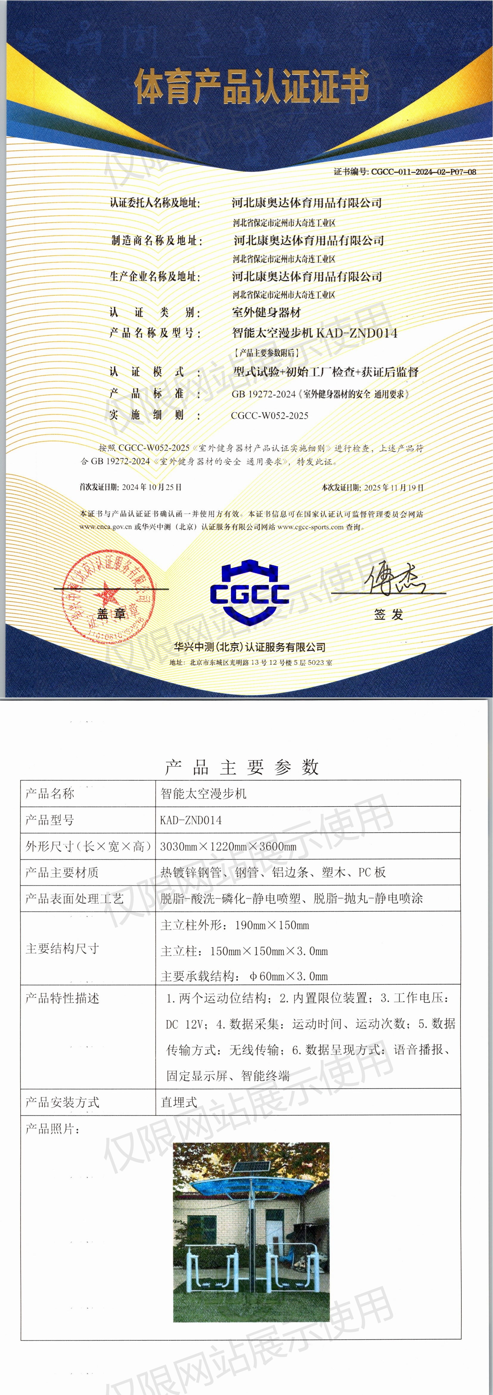 | 1 | 河北康奥达体育用品有限公司 | CGCC-011-2024-02-P07-08 | 智能太空漫步机 | KAD-ZND014 | 河北省保定市定州市大奇连工业区 | GB 19272-2024 | 2024-10-25 | 有效 | 查看 |