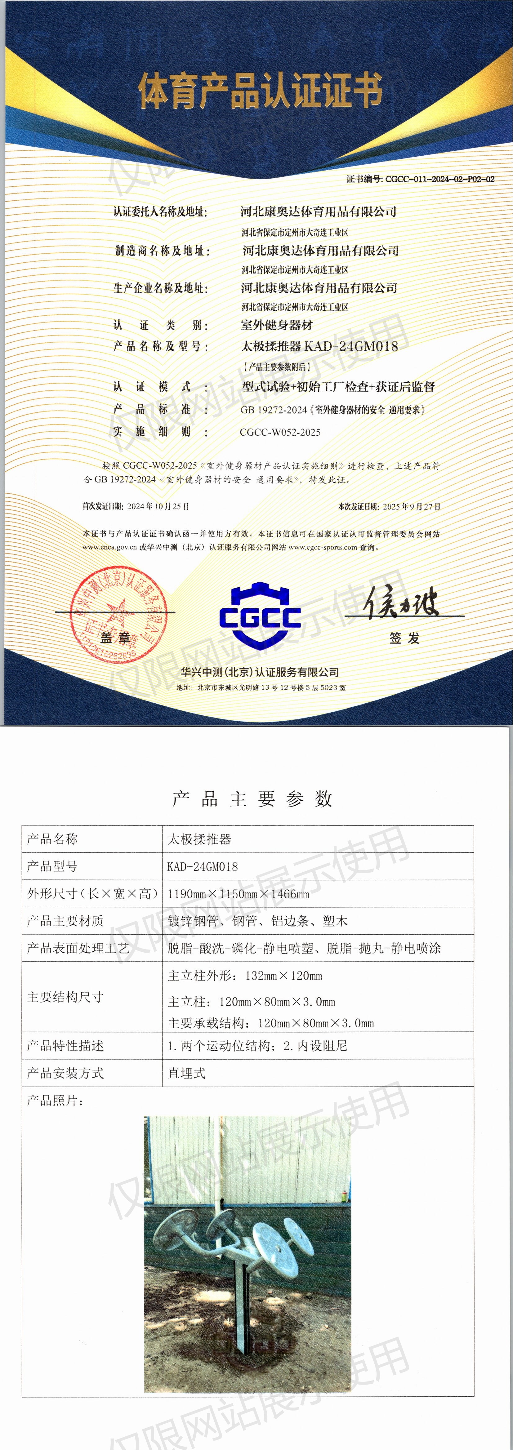 | 9 | 河北康奥达体育用品有限公司 | CGCC-011-2024-02-P02-02 | 太极揉推器 | KAD-24GM018 | 河北省保定市定州市大奇连工业区 | GB 19272-2024 | 2024-10-25 | 有效 | 查看 |