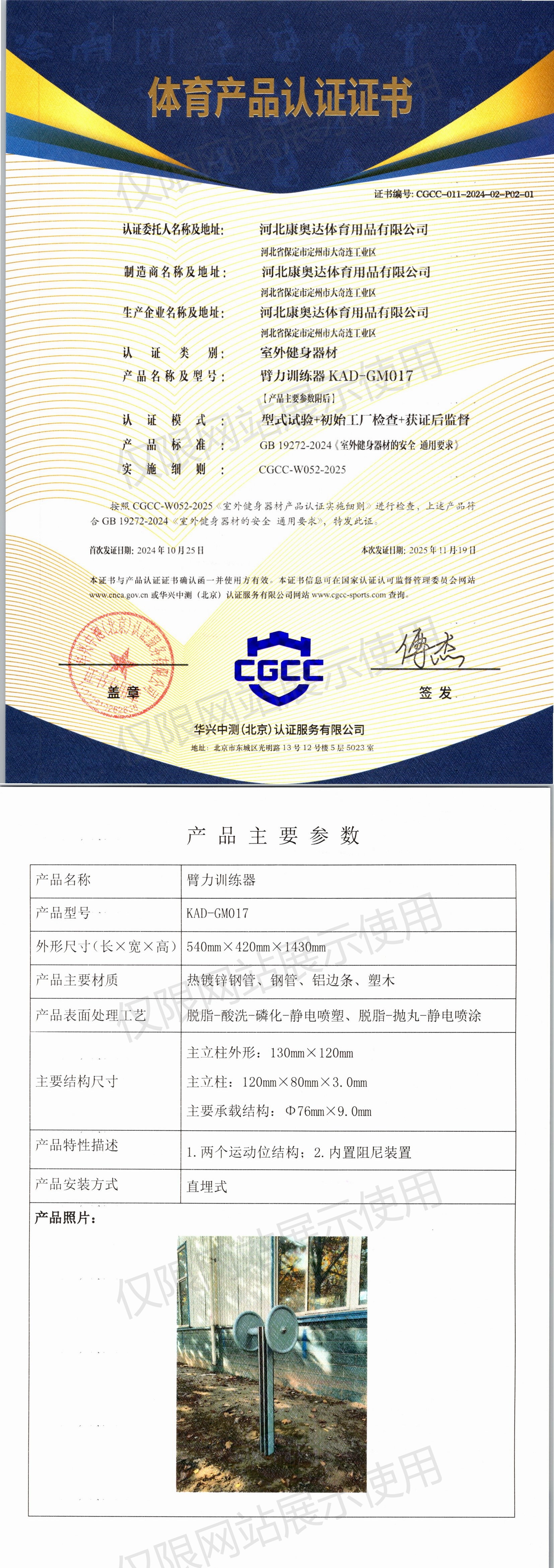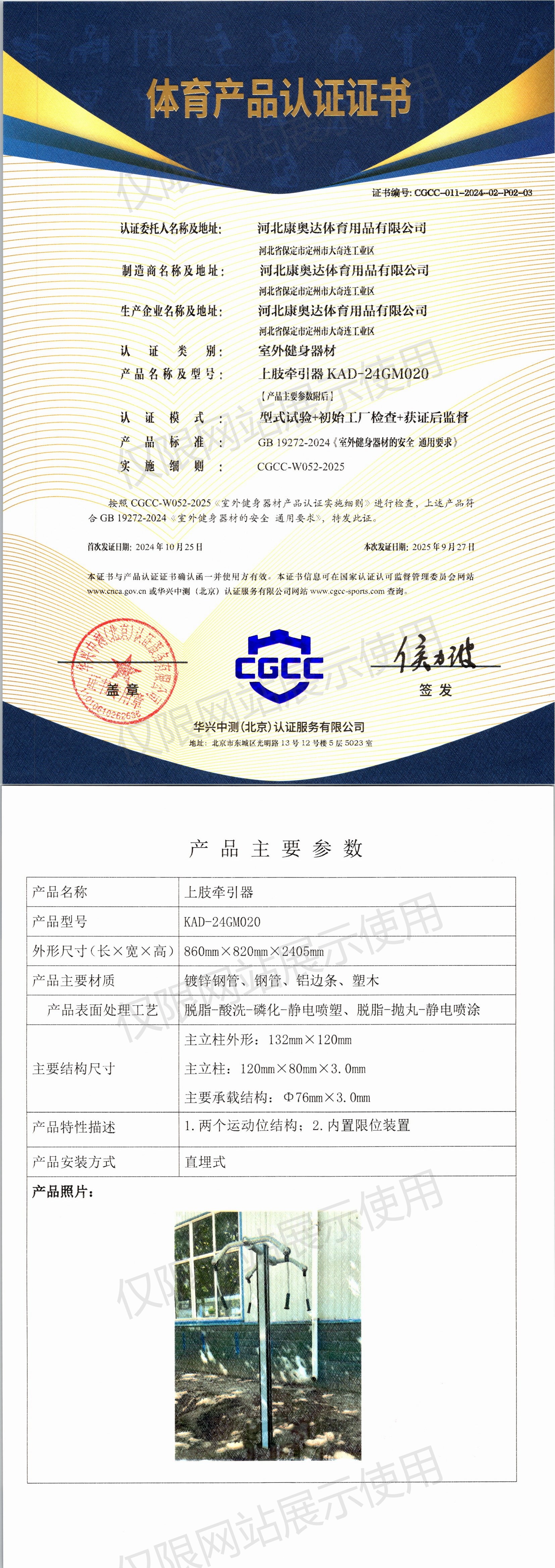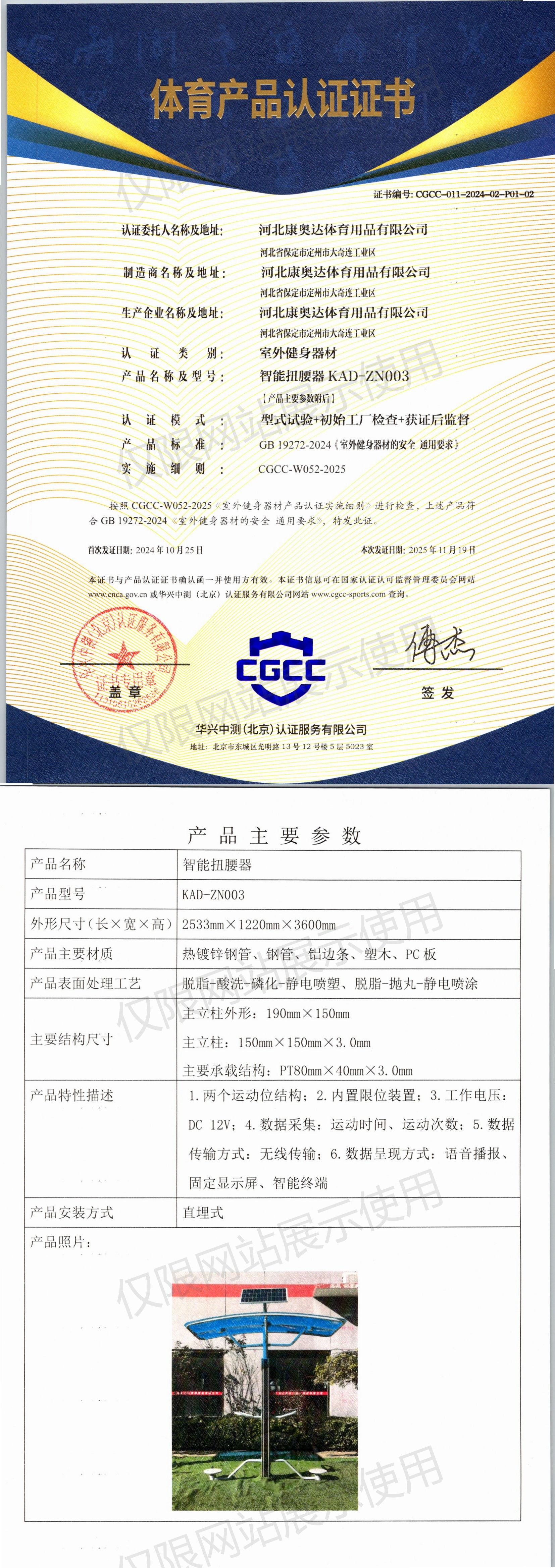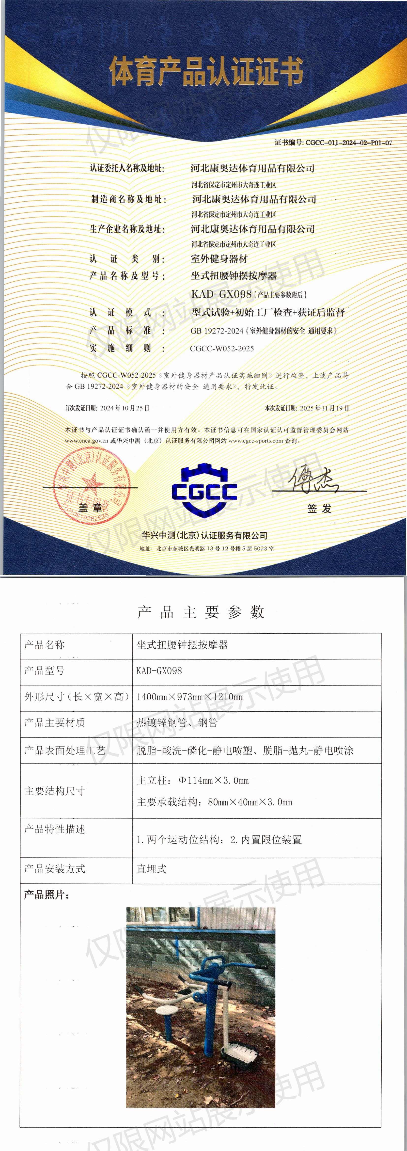| 1 | 河北康奥达体育用品有限公司 | CGCC-011-2024-02-P01-01 | 三位扭腰器 | KAD-24GM005 | 河北省保定市定州市大奇连工业区 | GB 19272-2024 | 2024-10-25 | 有效 | 查看 |