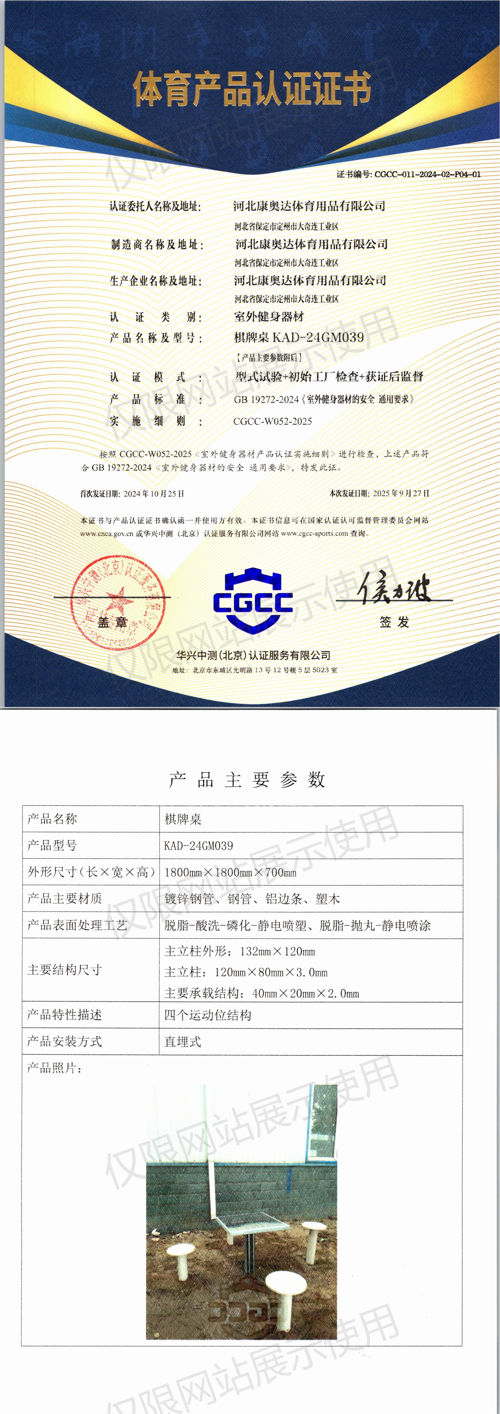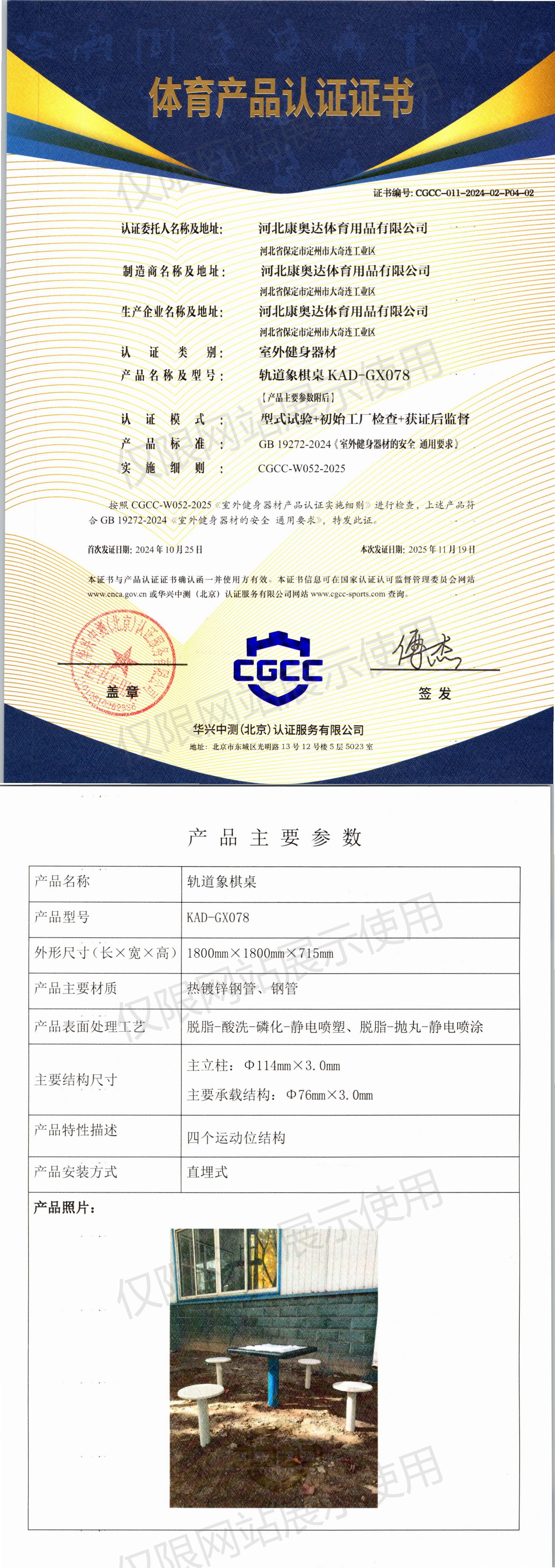 | 6 | 河北康奥达体育用品有限公司 | CGCC-011-2024-02-P04-02 | 轨道象棋桌 | KAD-GX078 | 河北省保定市定州市大奇连工业区 | GB 19272-2024 | 2024-10-25 | 有效 | 查看 |