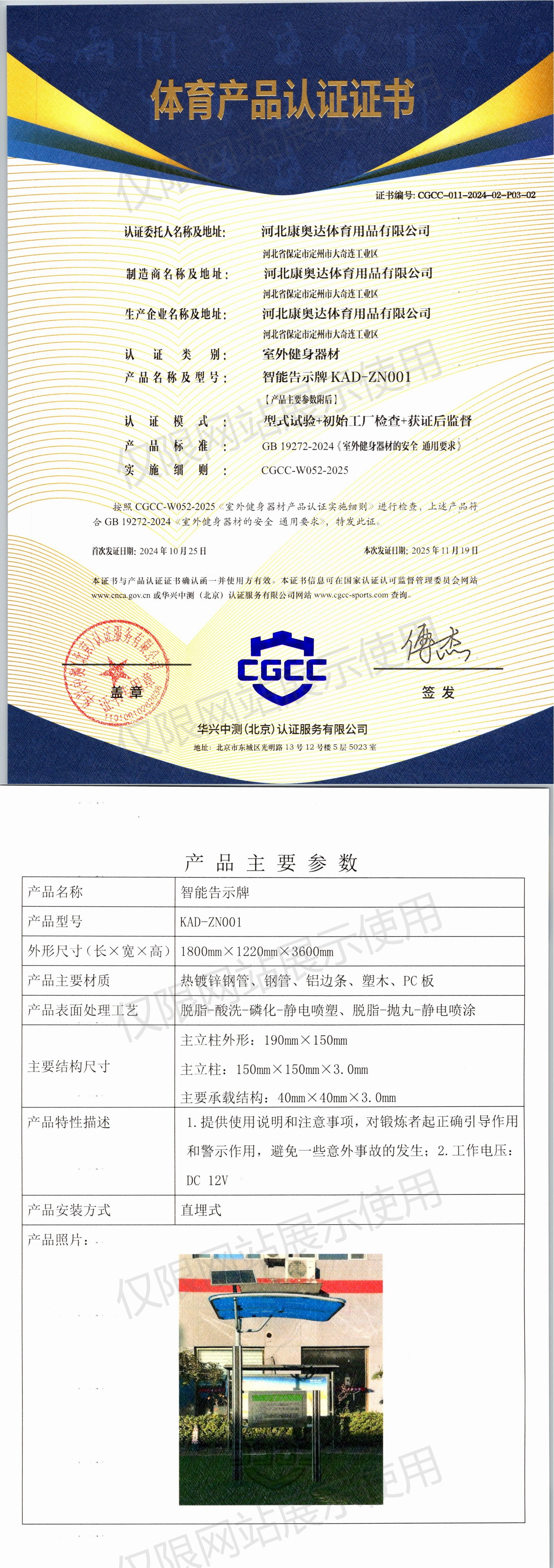 | 2 | 河北康奥达体育用品有限公司 | CGCC-011-2024-02-P03-01 | 告示牌 | KAD-24GM001 | 河北省保定市定州市大奇连工业区 | GB 19272-2024 | 2024-10-25 | 有效 | 查看 |