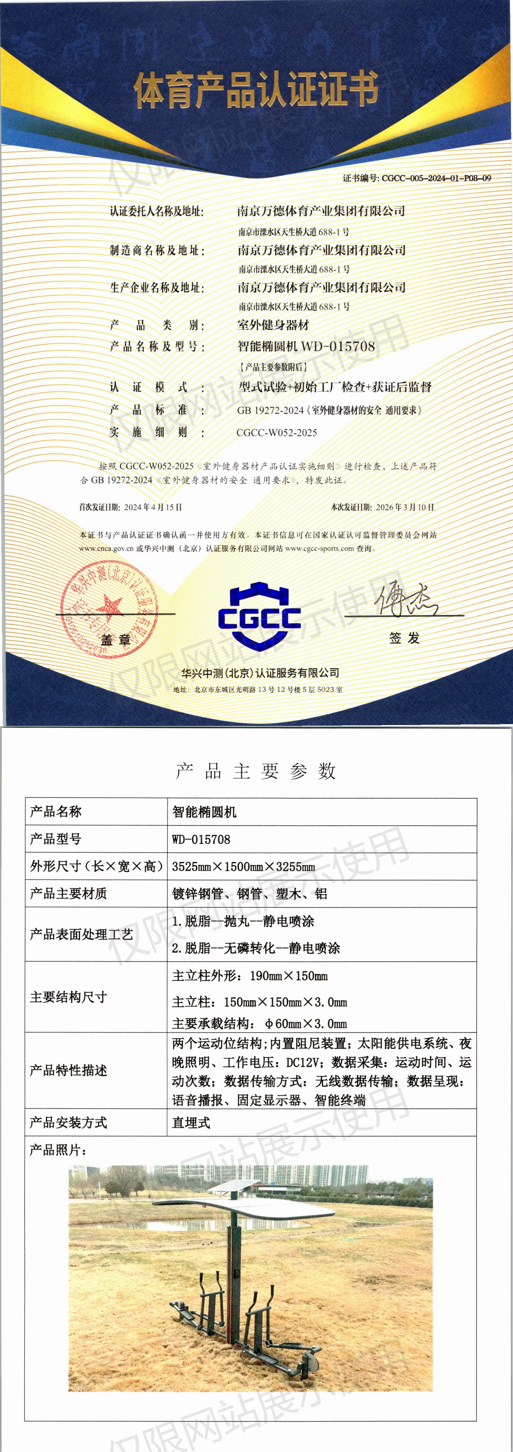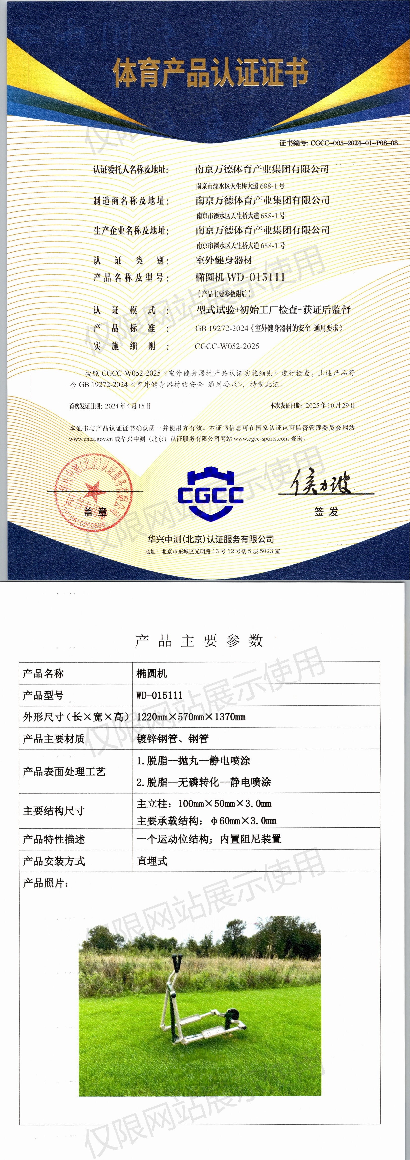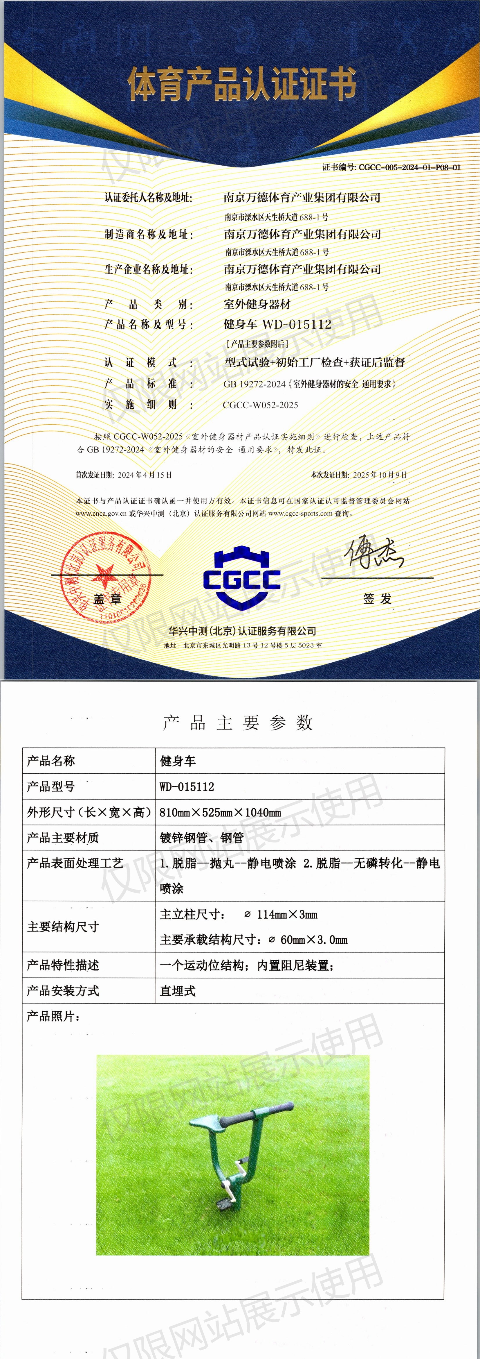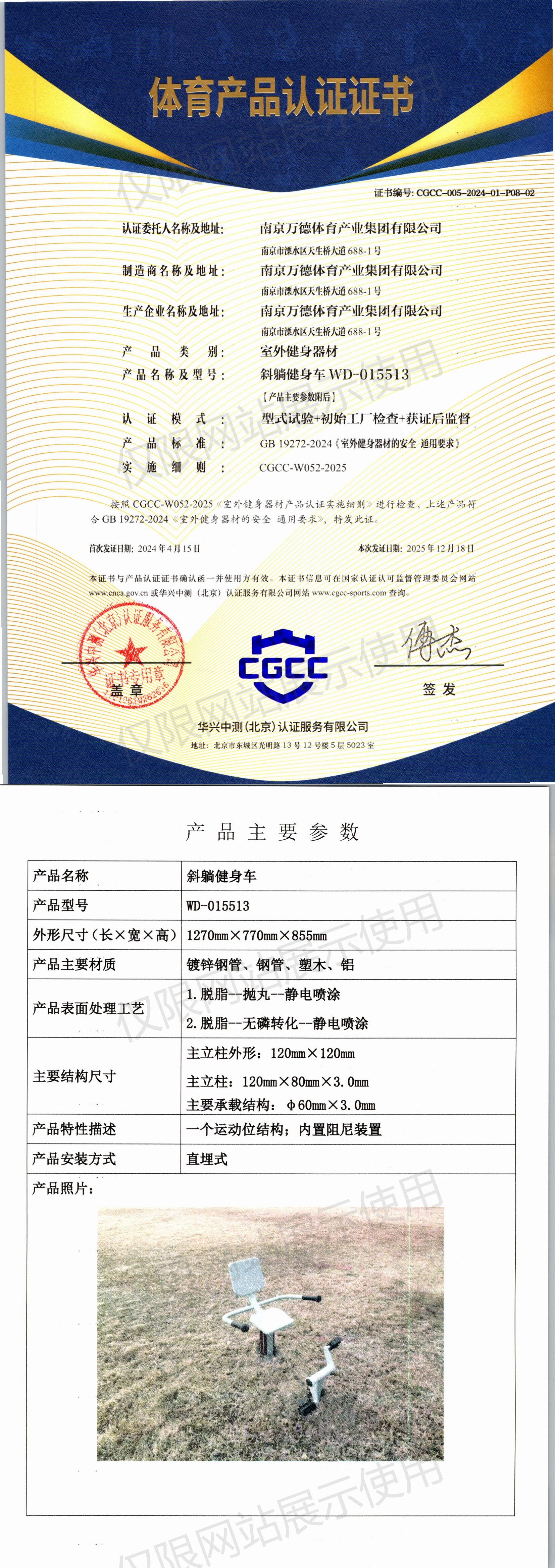 | 3 | 南京万德体育产业集团有限公司 | CGCC-005-2024-01-P08-02 | 斜躺健身车 | WD-015513 | 南京市溧水区天生桥大道688-1号 | GB 19272-2024 | 2024-04-15 | 有效 | 查看 |