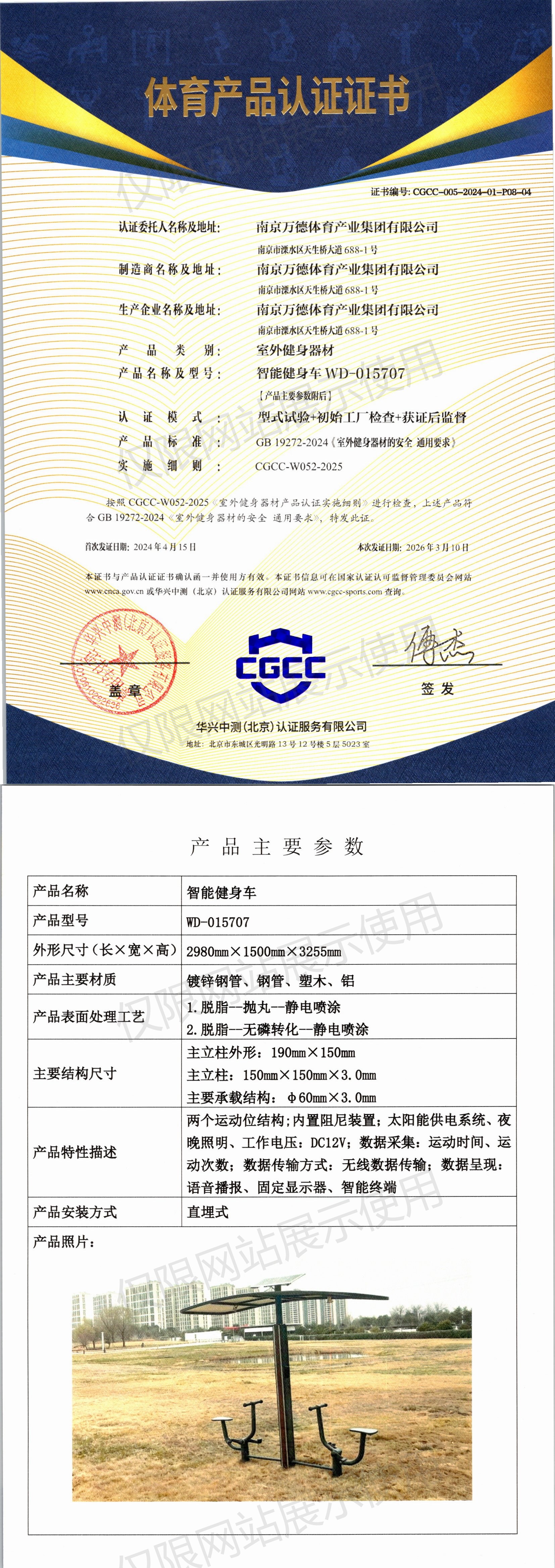 | 5 | 南京万德体育产业集团有限公司 | CGCC-005-2024-01-P08-04 | 智能健身车 | WD-015707 | 南京市溧水区天生桥大道688-1号 | GB 19272-2024 | 2024-04-15 | 有效 | 查看 |