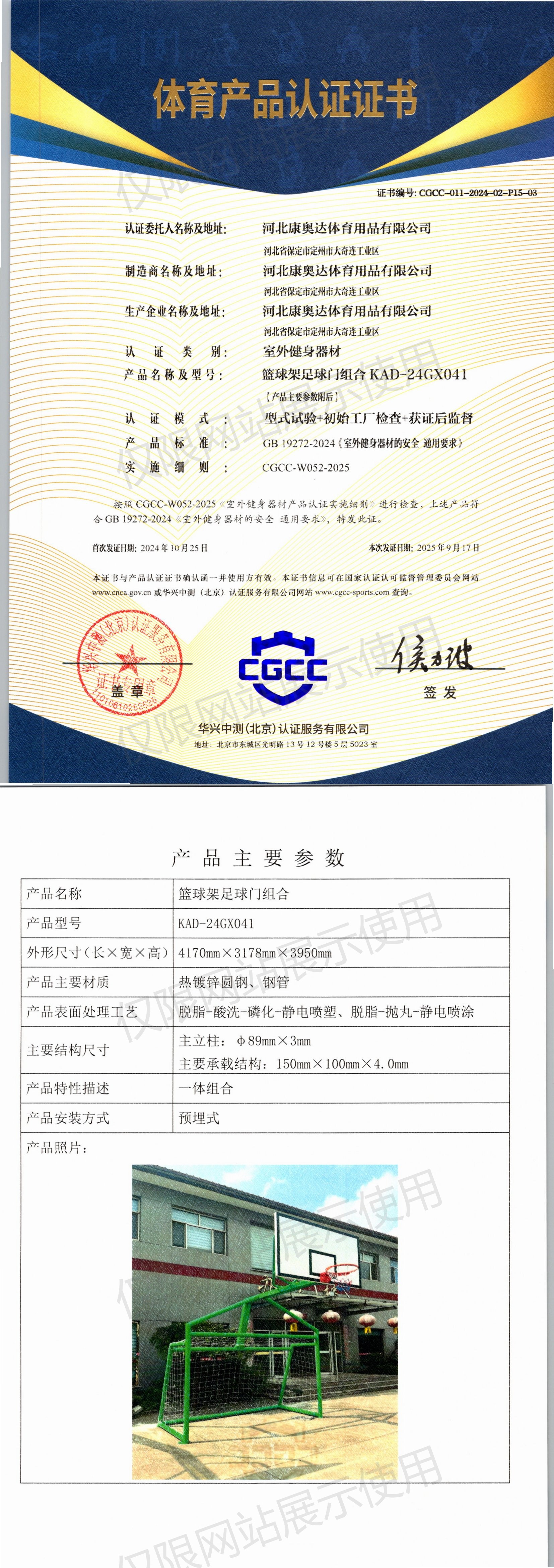 | 6 | 河北康奥达体育用品有限公司 | CGCC-011-2024-02-P15-03 | 篮球架足球门组合 | KAD-24GX041 | 河北省保定市定州市大奇连工业区 | GB 19272-2024 | 2024-10-25 | 有效 | 查看 |