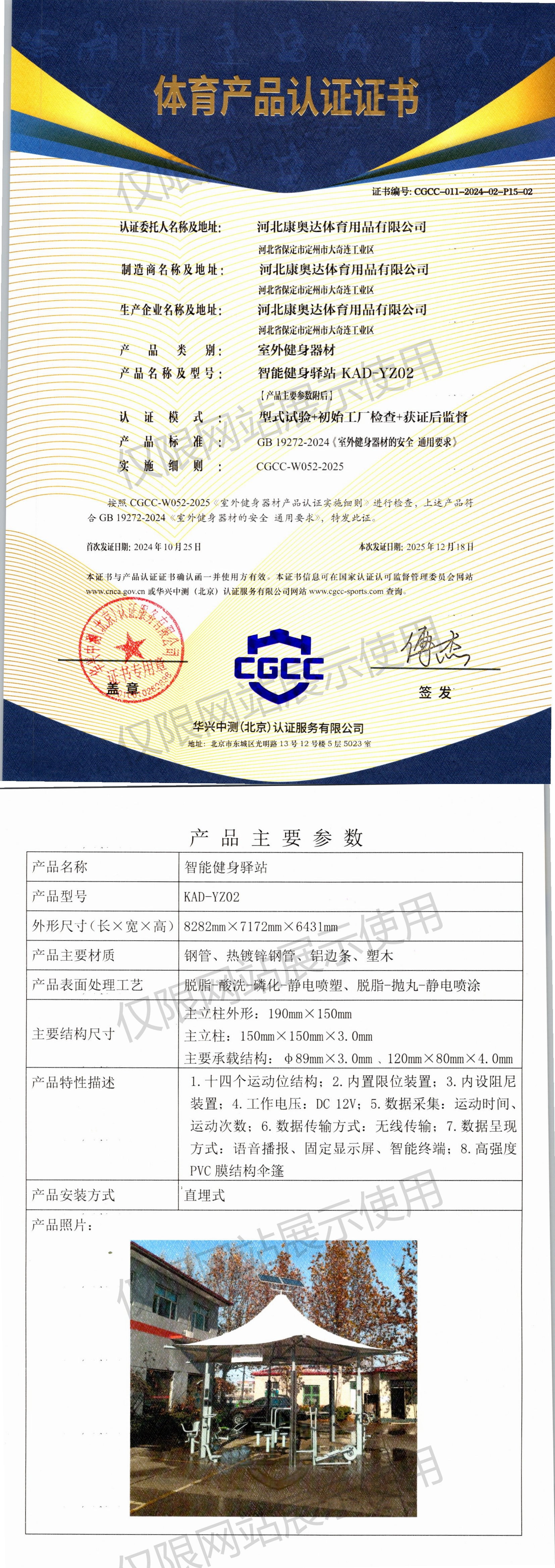 | 5 | 河北康奥达体育用品有限公司 | CGCC-011-2024-02-P15-02 | 智能健身驿站 | KAD-YZ02 | 河北省保定市定州市大奇连工业区 | GB 19272-2024 | 2024-10-25 | 有效 | 查看 |