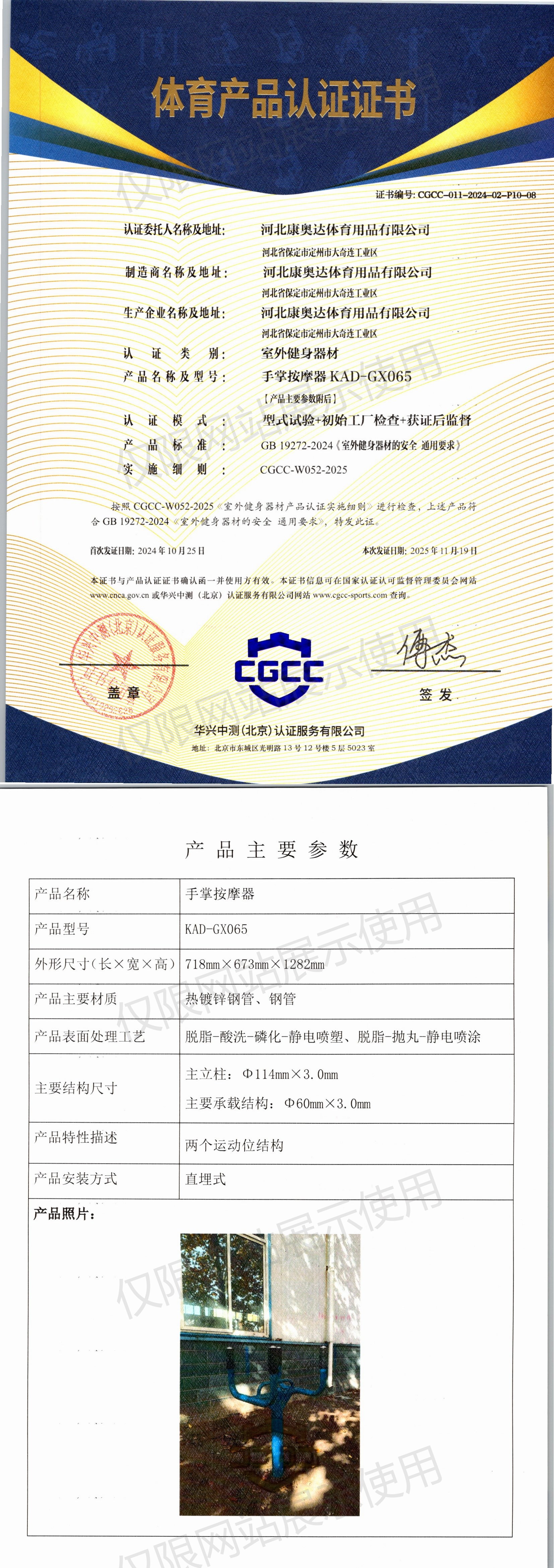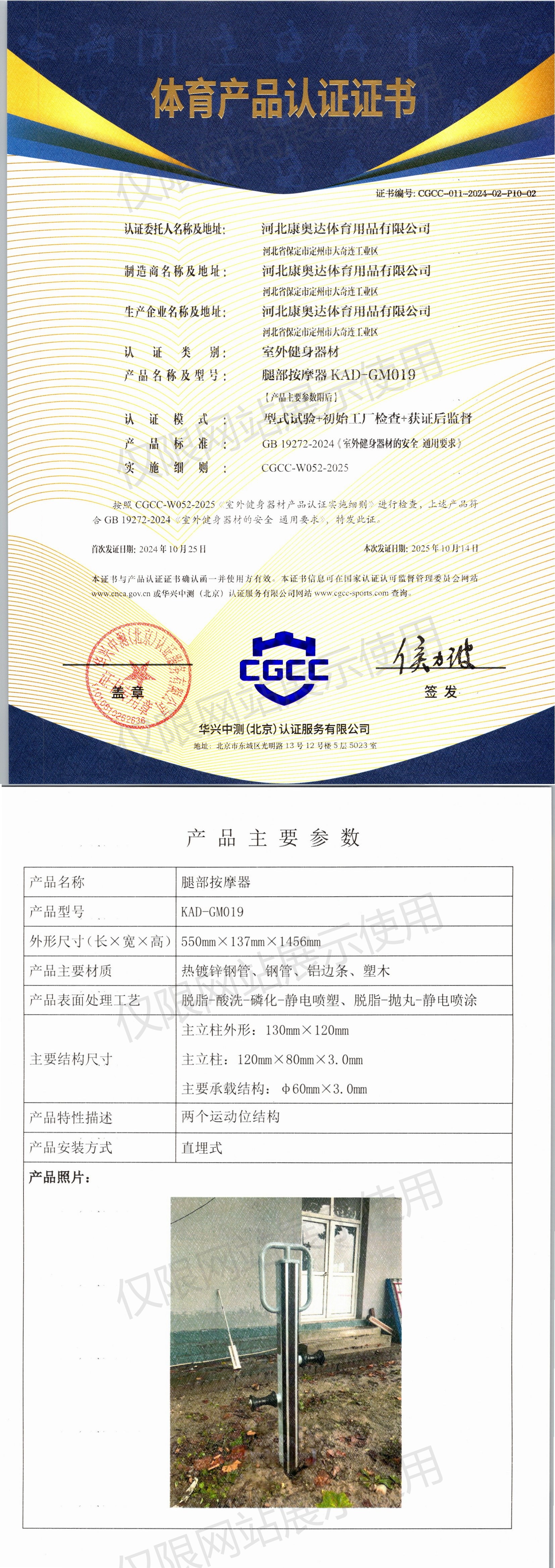 | 5 | 河北康奥达体育用品有限公司 | CGCC-011-2024-02-P07-11 | 三位漫步机 | KAD-GX015 | 河北省保定市定州市大奇连工业区 | GB 19272-2011 | 2024-10-25 | 有效 | 查看 |