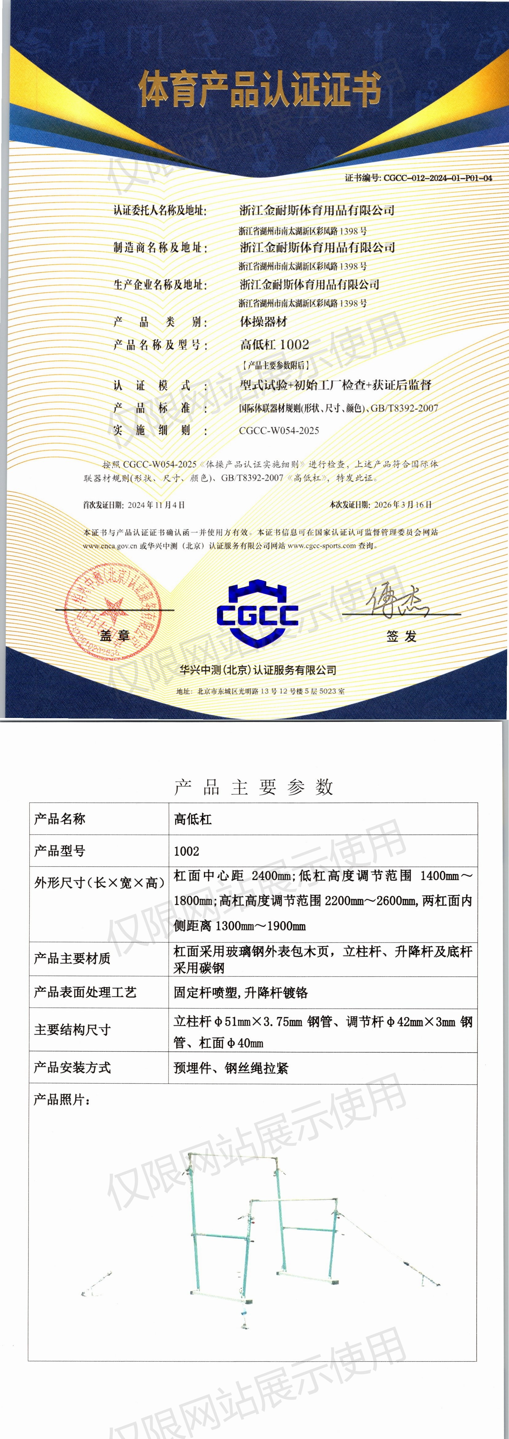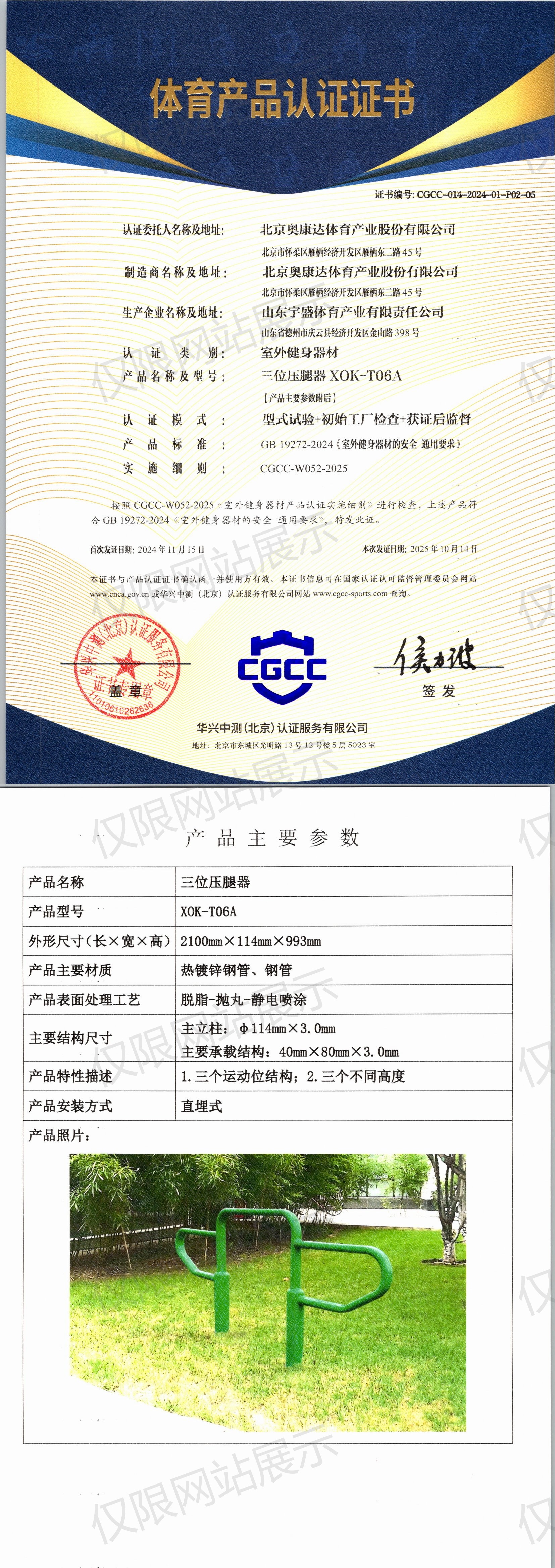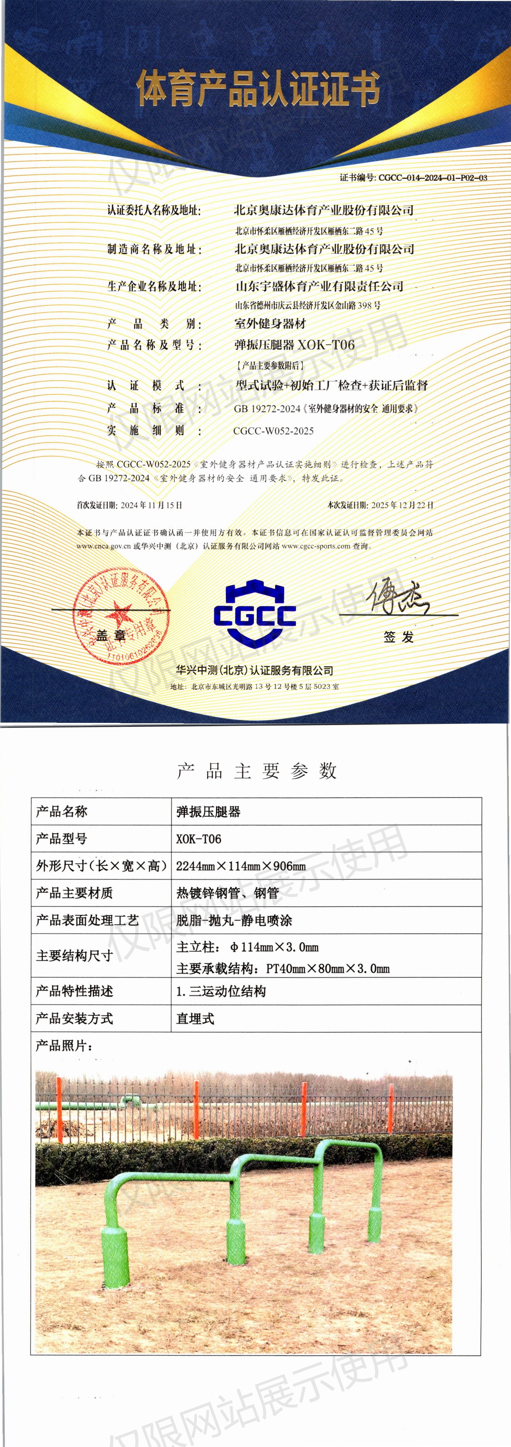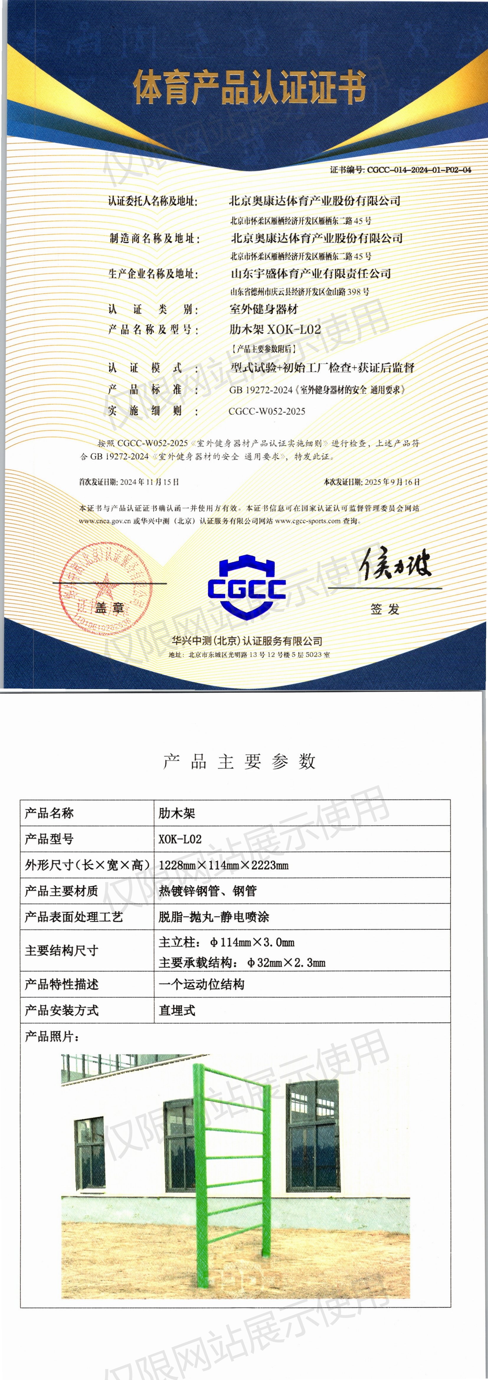 | 10 | 北京奥康达体育产业股份有限公司 | CGCC-014-2024-01-P02-06 | 双杠 | XOK-S03 | 山东省德州市庆云县经济开发区金山路398号 | GB 19272-2024 | 2024-11-15 | 有效 | 查看 |
