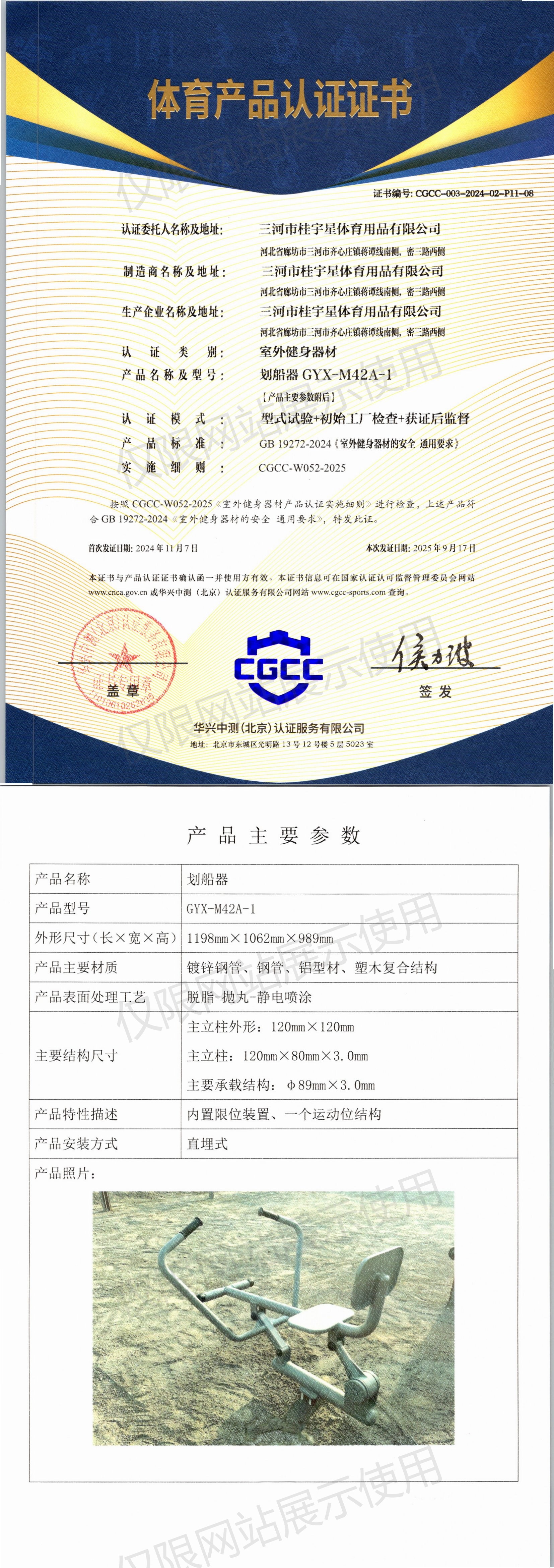 | 3 | 三河市桂宇星体育用品有限公司 | CGCC-003-2024-02-P11-08 | 划船器 | GYX-M42A-1 | 河北省廊坊市三河市齐心庄镇蒋谭线南侧,密三路西侧 | GB 19272-2024 | 2024-11-07 | 有效 | 查看 |