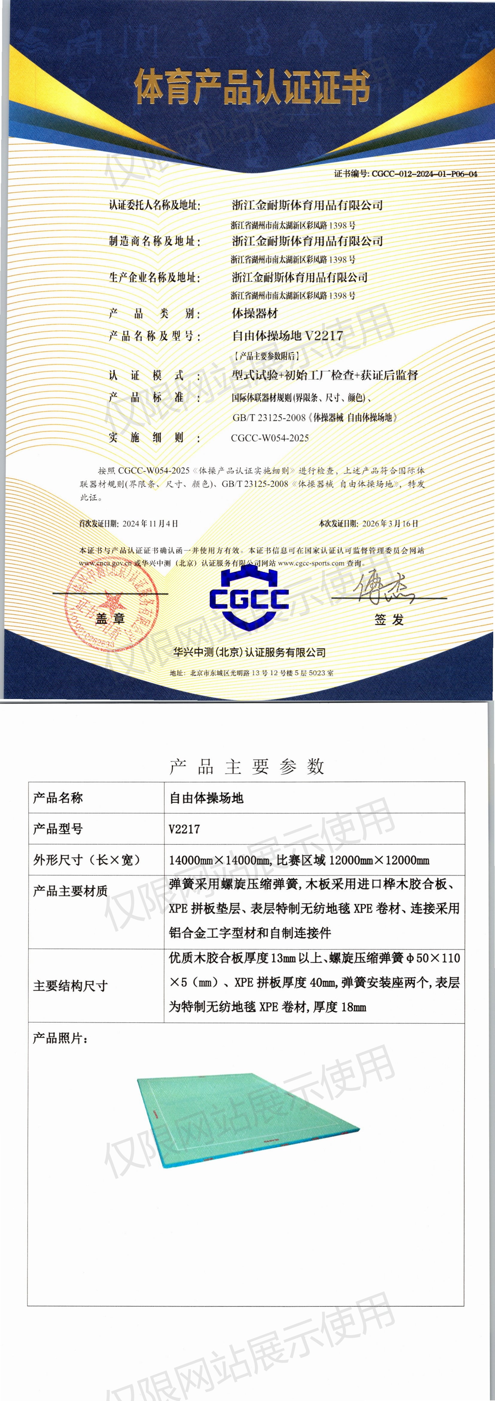 | 1 | 浙江金耐斯体育用品有限公司 | CGCC-012-2024-01-P06-04 | 自由体操场地 | V2217 | 浙江省湖州市南太湖新区彩凤路1398号 | 国际体联器材规则(界限条、尺寸、颜色)、GB/T23125-2008 | 2024-11-04 | 有效 | 查看 |
